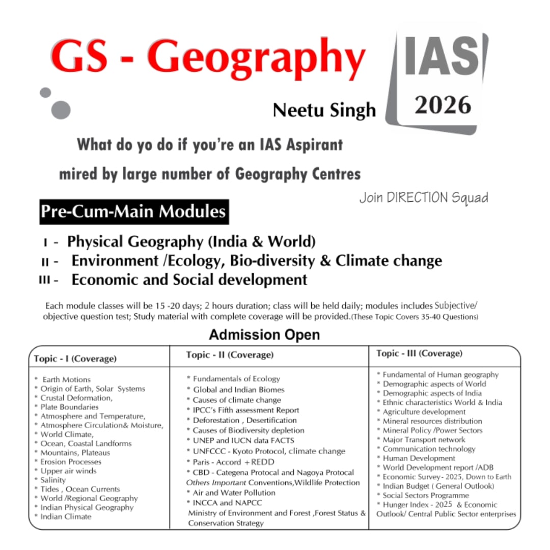 Geography holds significant importance in both the UPSC Prelims and Main examinations under the General Studies (GS) paper. Apart from three topics in GS Paper I Prelims ,it overlaps with more than half of Paper II and near all Paper III in Main . It also helps aspirants in Essay Writing and International Relations. We at DIRECTION IAS provide customized Prelims cum Main GS Classes. A thorough understanding of geographical concepts, along with the ability to link them to current affairs and other subjects, can significantly enhance a candidate’s performance in the UPSC Civil Services Examination.
